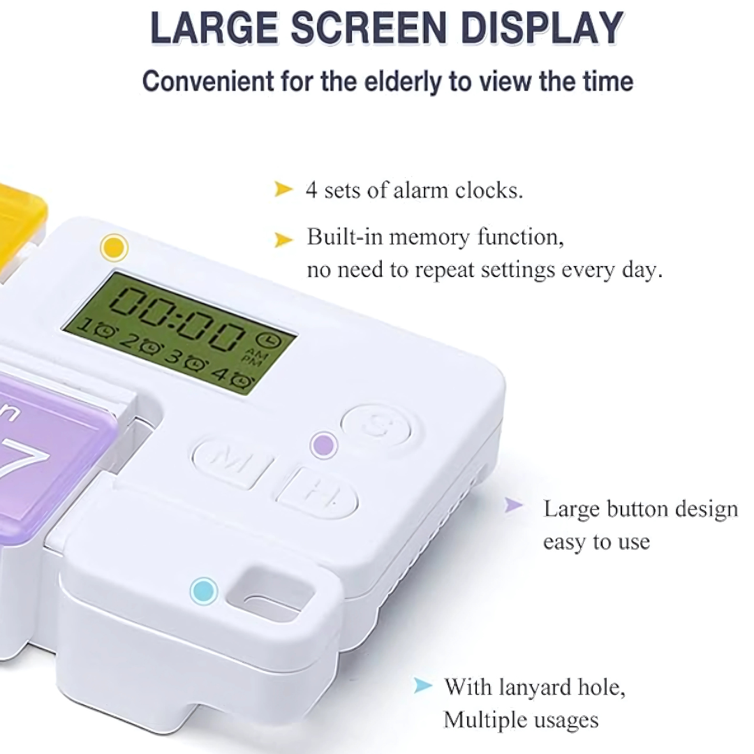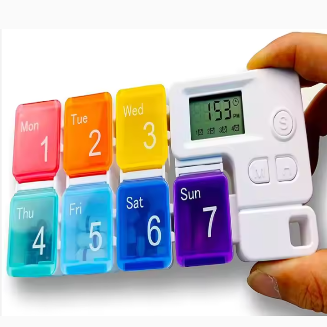 Take the guesswork out of daily medication with the 7-Day Pill Box, a smart electronic pill organizer designed for convenience, reliability, and ease of use. With seven individually labelled compartments for each day of the week and up to four customizable alarms, this digital storage box helps you manage complex medication schedules with precision. The loud beep reminder, easy-to-open lids, and memory function ensure no dose is missed, making it a perfect companion for elderly individuals, chronic illness patients, caregivers, and busy professionals.