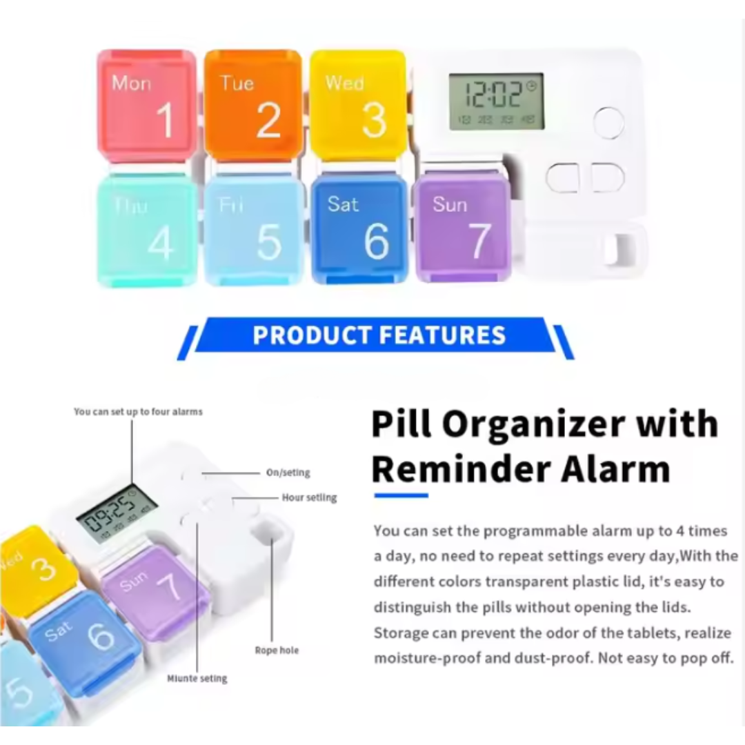 Portable 7days Smart Electronic Digital Alarm Pill Organizer Storage Box with Reminder. This smart pill organizer comes with 7 labelled compartments for each day of the week and up to 4 customizable alarms per day. It features a loud beep reminder, and easy-to-open lids for each day’s dose. The compact, travel-friendly design makes it ideal for home or on-the-go use. Perfect for managing daily medication schedules with accuracy and ease.