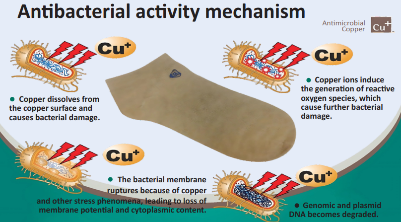 Nano-Copper Infusion Nano-Copper particles are embedded directly into the fibers. Copper ions (Cu⁺) are released when the socks come into contact with moisture (like sweat).